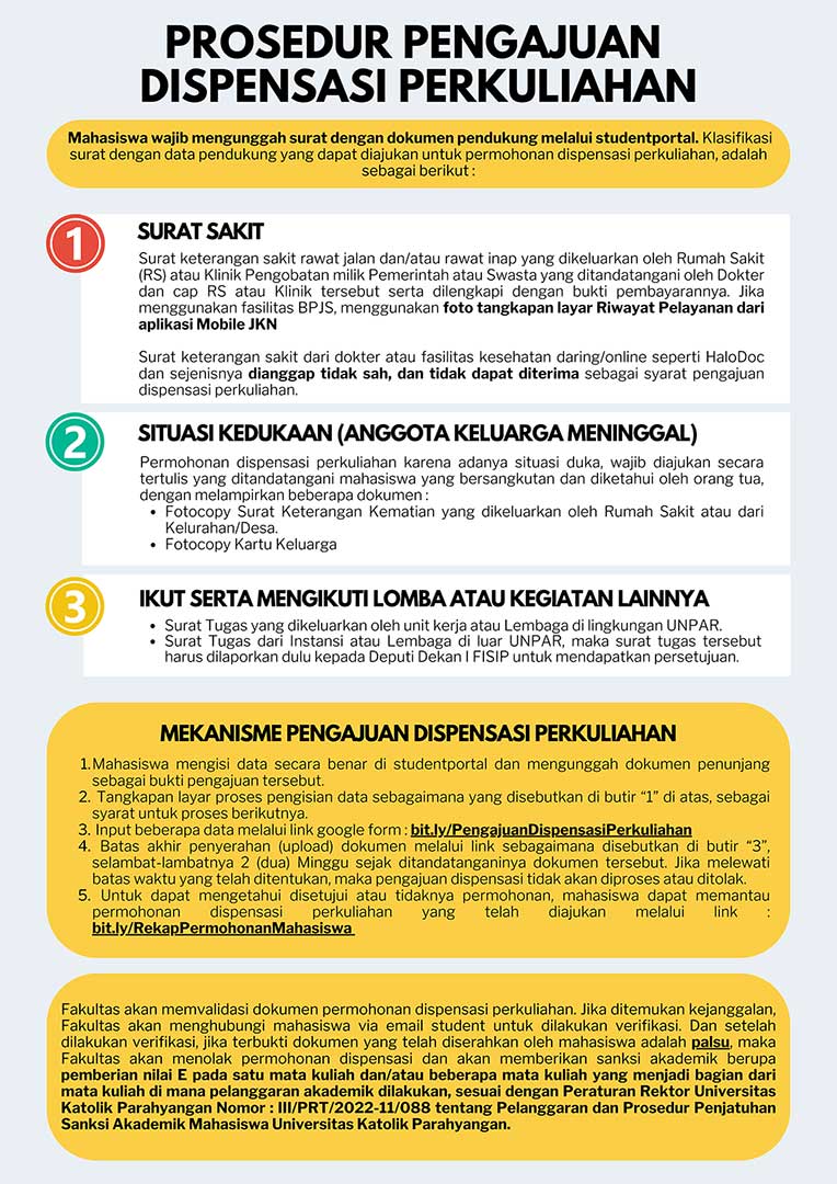 Berikut ini kami sampaikan Prosedur Permohonan Pengajuan Dispensasi Perkuliahan di Fakultas Ilmu Sosial dan Ilmu Politik Universitas Katolik Parahyangan :