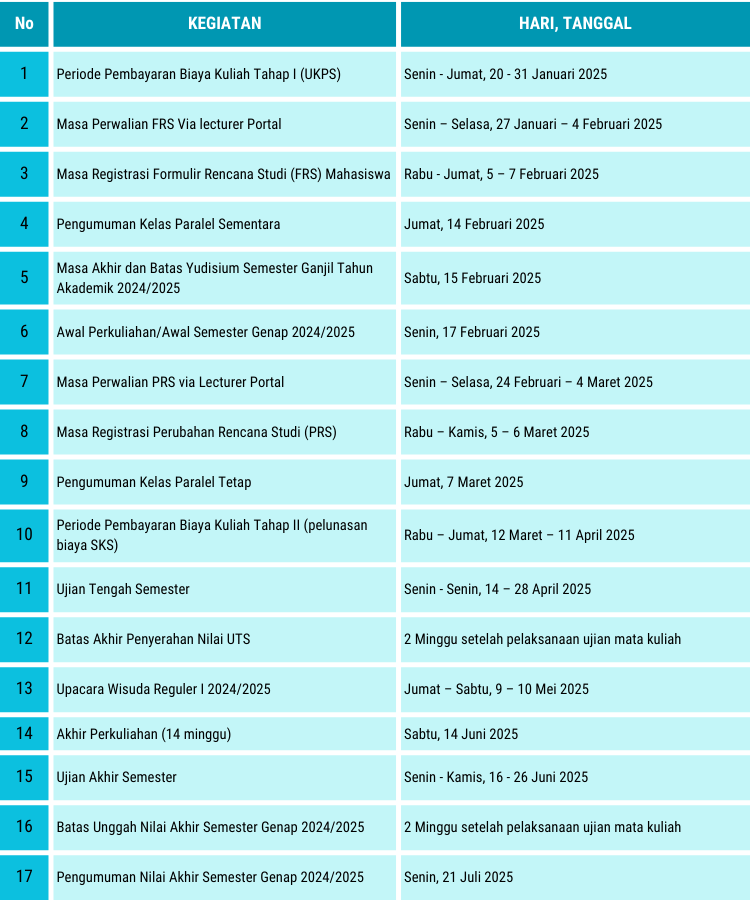 | 31 | Awal Perkuliahan Semester Genap 2024/2025 | Rabu, 18 Februari 2026 |